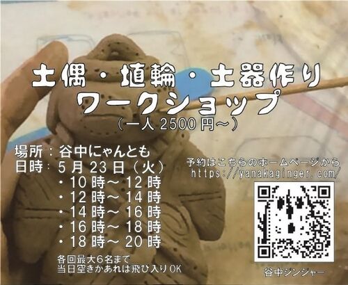 今期2度目の出張ワークショップします。 今回は、土偶埴輪土器作りワークショップです。(土偶でも埴輪でも火焔型土器でもお好きなものを作っていただけます。) 今度は、平日。 5月23日(火曜日) 前回と同じ会場です。 日時:2023年5月23日(火曜日)…